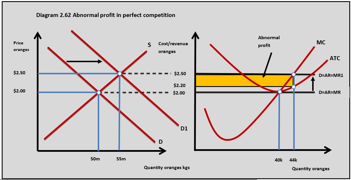 In the orange market example, an increase in demand for oranges from D to D1 causes the market price to rise from $2.00 to $2.50 and this means individual firms in the industry are receiving a higher price which results in AR rising above ATC leading to abnormal profits.