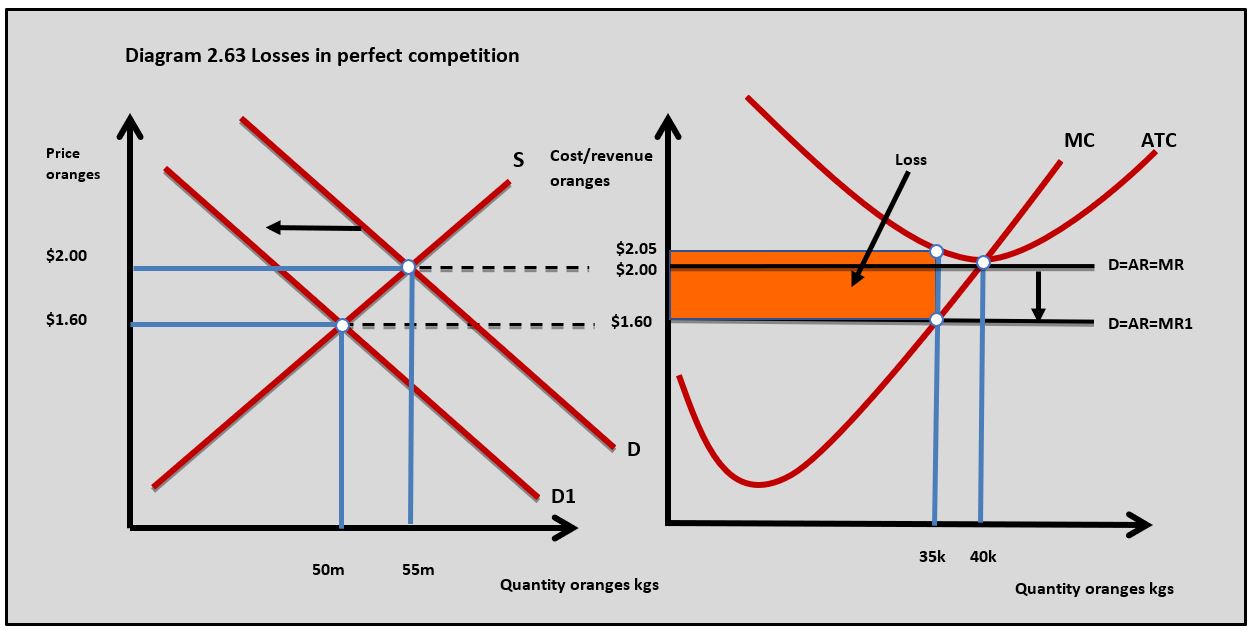 This means firms are making less than normal profit so entrepreneurs will start to leave the industry because they are not making enough profit to keep them in the market. Diagram 2.63 shows how a fall in market demand from D to D1 for oranges leads to losses as the market price falls from $2.00 to $1.60 and average revenue falls below average total cost.