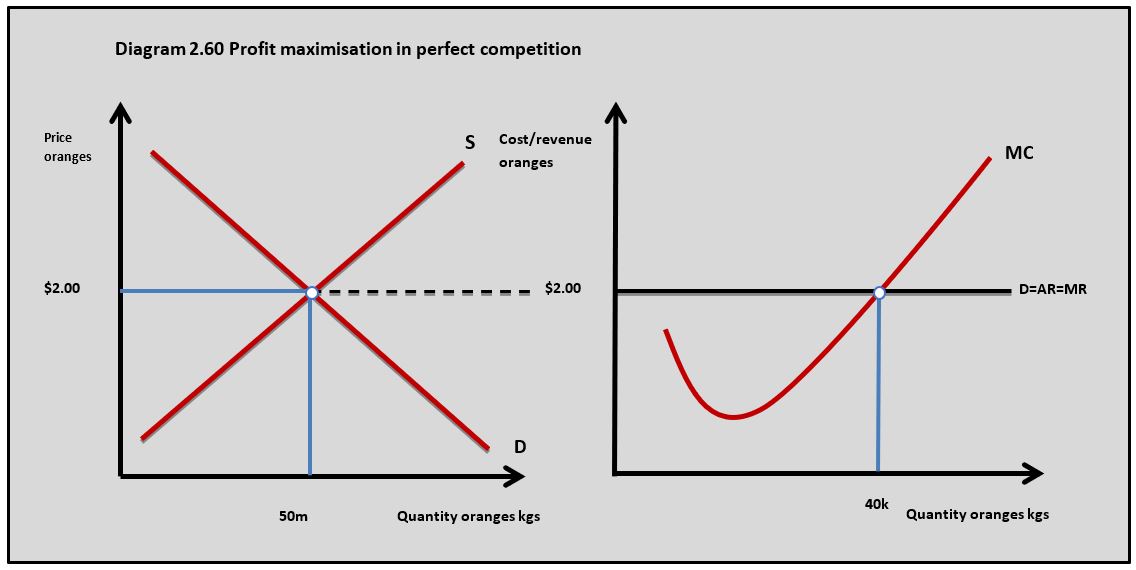 Classical economic theory assumes firms in the industry aim to profit maximise which means they produce where marginal cost equals marginal revenue when marginal cost is rising. In diagram 2.60 the firm produces 40,000 kgs of oranges per month to profit maximise. Adding together the total output of each producer in the market gives a total market output of 50 million kgs per month.