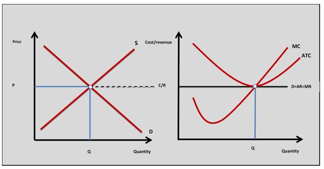 Similar to short-run equilibrium this is the output where market demand equals supply, but firms in the market are all making normal profit. Because there are no abnormal profits or losses in the market means there are no pressures on market price and output to change.
