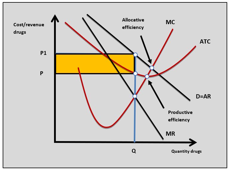 - An explanation that the monopolist in the drug market does not achieve allocative efficiency because it sets a price that is higher than the marginal cost. This means the price is higher and output lower than in a perfectly competitive market.