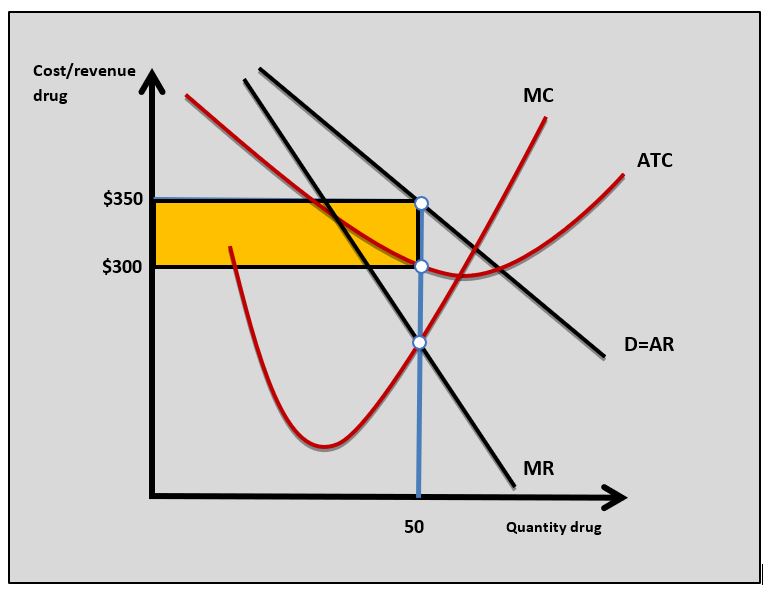 - An explanation that the monopolist in the drug market fails to achieve productive efficiency because it does not produce where ATC = MC. This results in higher costs of production and may mean a higher price for the consumer.