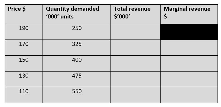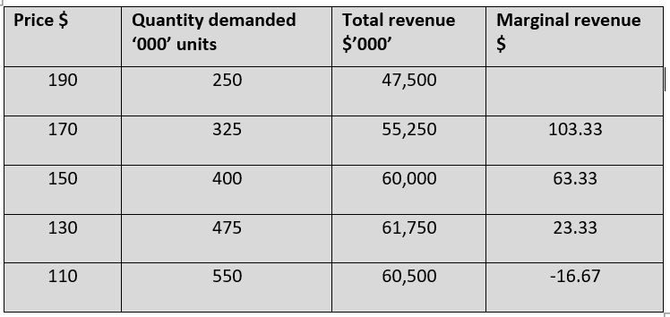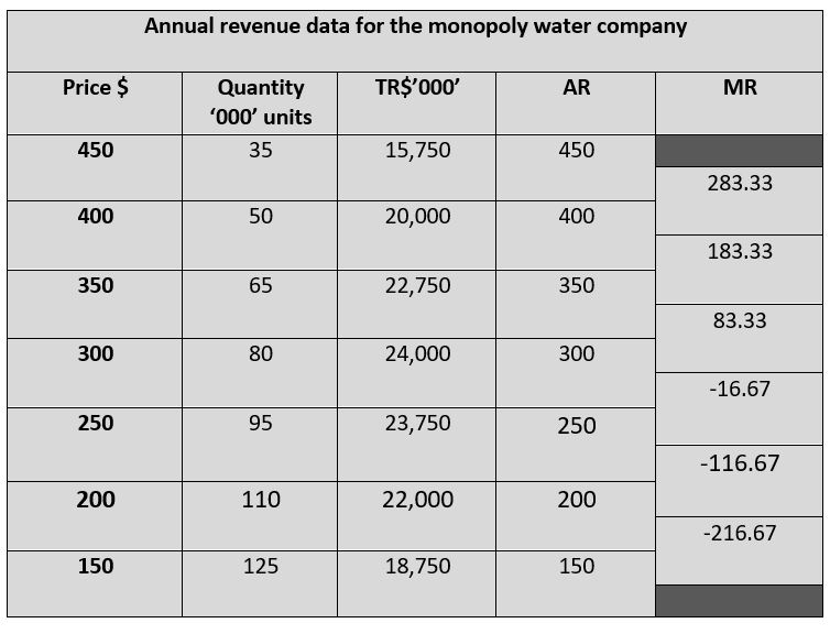 Where an industry is dominated by a monopoly producer the firm is considered to be a price maker because there is no competition in the market. The barriers to entry the monopoly producer benefits from mean there are few close substitutes for the monopoly producer's product. This means the demand curve the monopoly firm faces is downward sloping. The demand curve is equal to average revenue, but the marginal revenue curve separates from the demand curve. With a downward sloping demand curve, the marginal revenue is twice as steep and becomes negative on the price inelastic section of the demand curve. This is shown in diagram 2.65. The table sets out price and revenue data for a monopoly producer in the domestic water market.