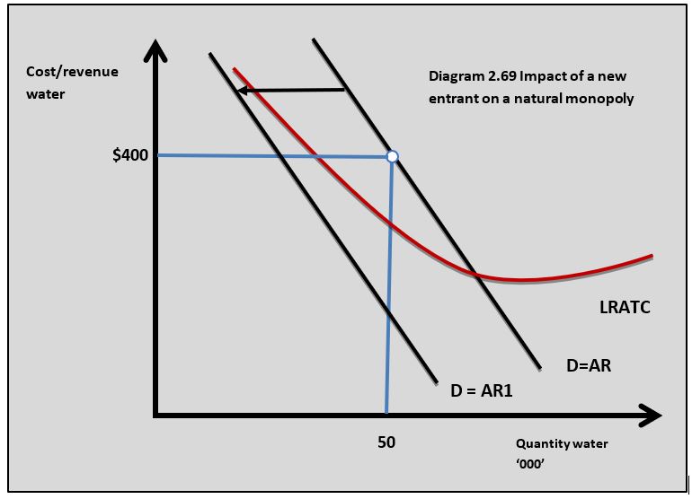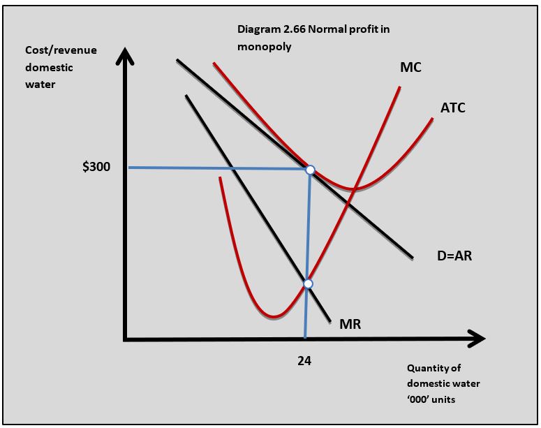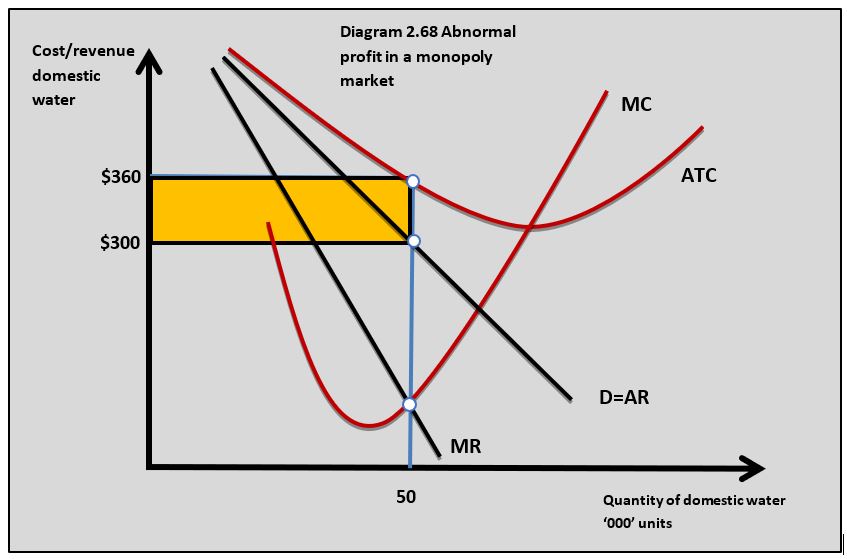 The barriers to entry that exist in a monopoly market mean the monopolist can earn abnormal profit in the long run because new firms cannot enter the market. For example, the abnormal profit earned in the domestic water market would be attractive to new entrants but they cannot enter the market because of the high fixed costs associated with setting up production.