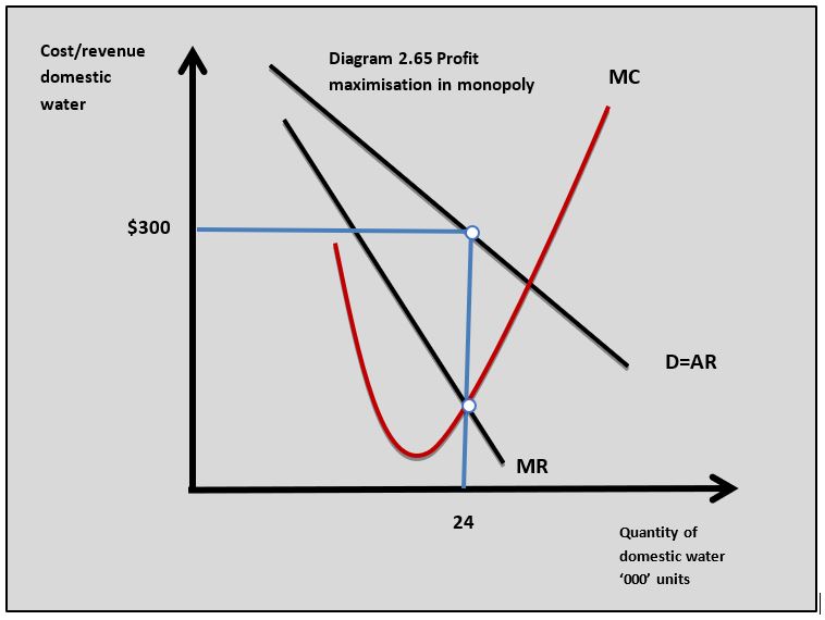 Monopoly firms aim to profit maximise by producing where marginal cost equals marginal revenue when marginal cost is rising. At the profit maximising output, the monopolist sets a price based on the demand curve at that level of output. The profit maximising output for the monopoly water business is shown in diagram 2.65. The profit maximising output occurs where marginal revenue is positive which means the monopoly firm produces on the elastic portion of the demand curve.