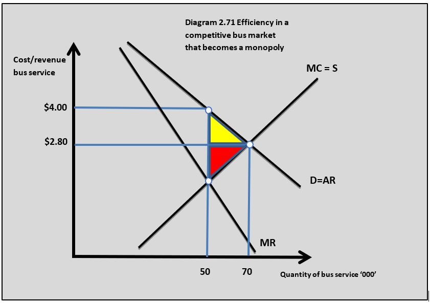 - The red shaded area is the loss of producer surplus when the small bus companies left the market and are not gained by the monopoly business and are the producer deadweight loss.