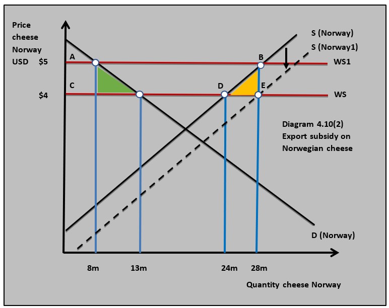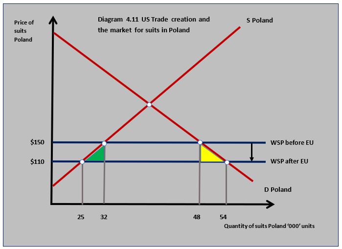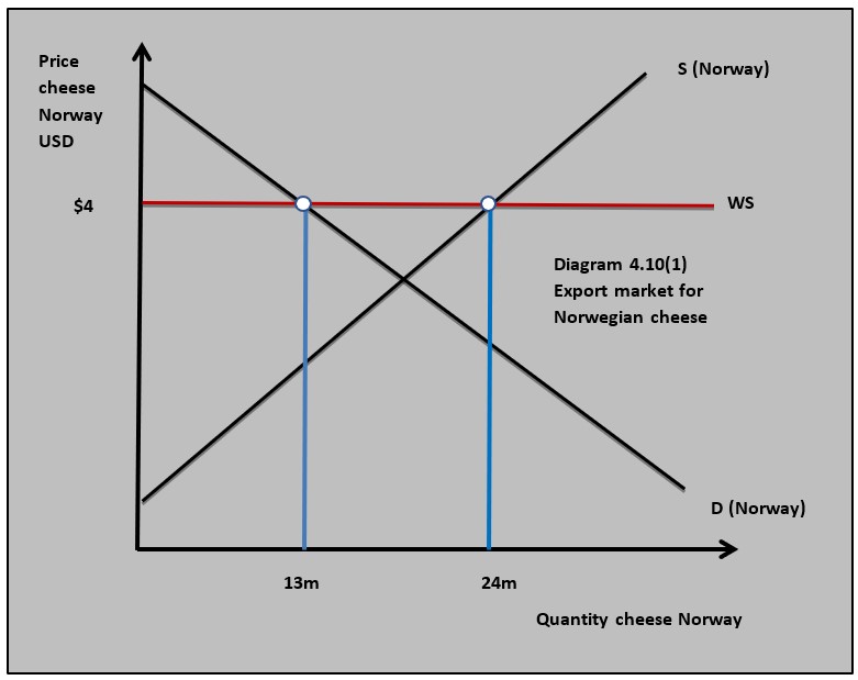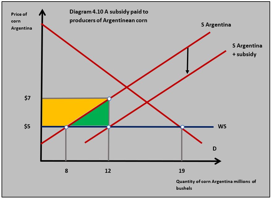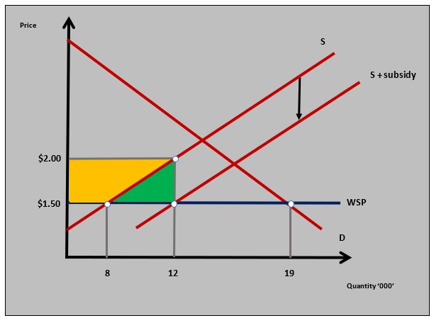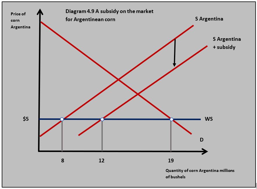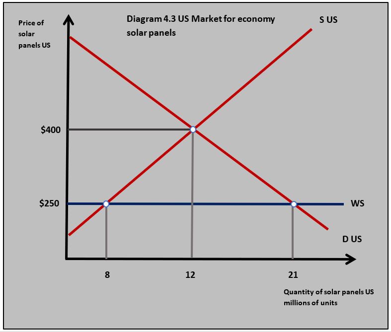 In diagram 4.3 the domestic demand and supply for solar panels would give a market price for solar panels of $400. By importing solar panels, consumers can buy them at $250 which is the world price. The world price is determined by the global demand and supply for solar panels. The world supply is shown by WS in diagram 4.3.