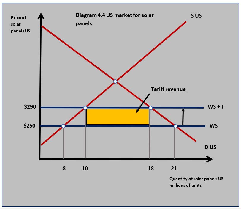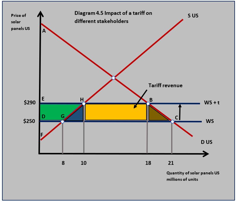 When a government puts a tariff on a good it impacts domestic consumers, domestic producers and the government. There will also be an impact on foreign producers and overall social welfare. In our US solar panel example, we can examine the impact of the tariff on the different stakeholders by using diagram 4.5.
