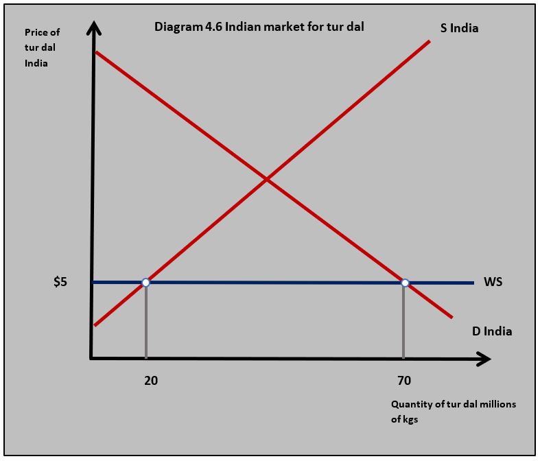 An example of the use of a quota is tur dal quotas imposed by the Indian government. Tur dal is a lentil used in cooking and is a basic staple food. Diagram 4.6 shows the market for tur dal in India. The world price is $5 per kg which means India’s domestic supply is 20 million kgs and domestic demand is 70 million kgs. This results in 50 million kgs of tur dal being imported into India.