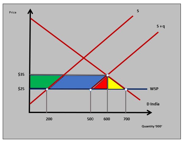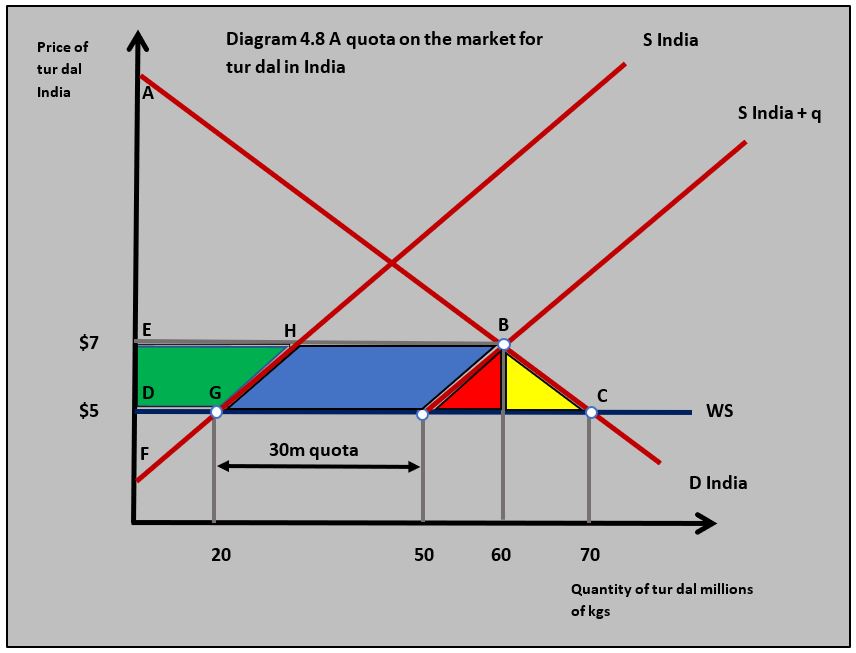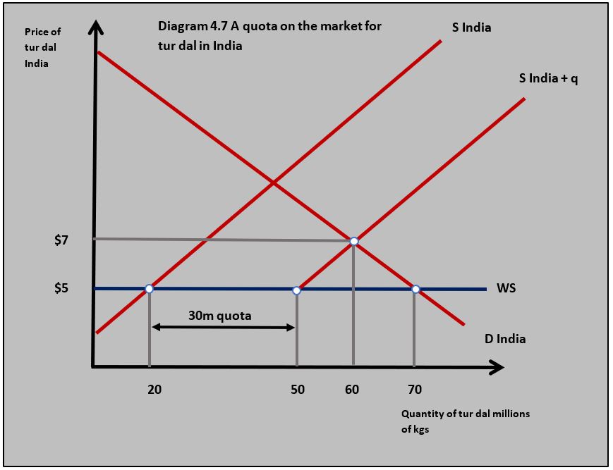 If the Indian government set a quota on tur dal of 30 million kgs to reduce the quantity imported from 50 million kgs to 30 million kgs.  Diagram 4.7 illustrates the impact of the quota on the market for tur dal in India. The 30 million tur dal quota is added to India’s domestic supply to give the domestic market supply for tur dal, S India + q. The market equilibrium for tur dal in India is where D India = S India + q at a price of $7 and a quantity of 60 million kgs. This means that domestic supply from India is 30 million kgs with 30 million kgs imported.