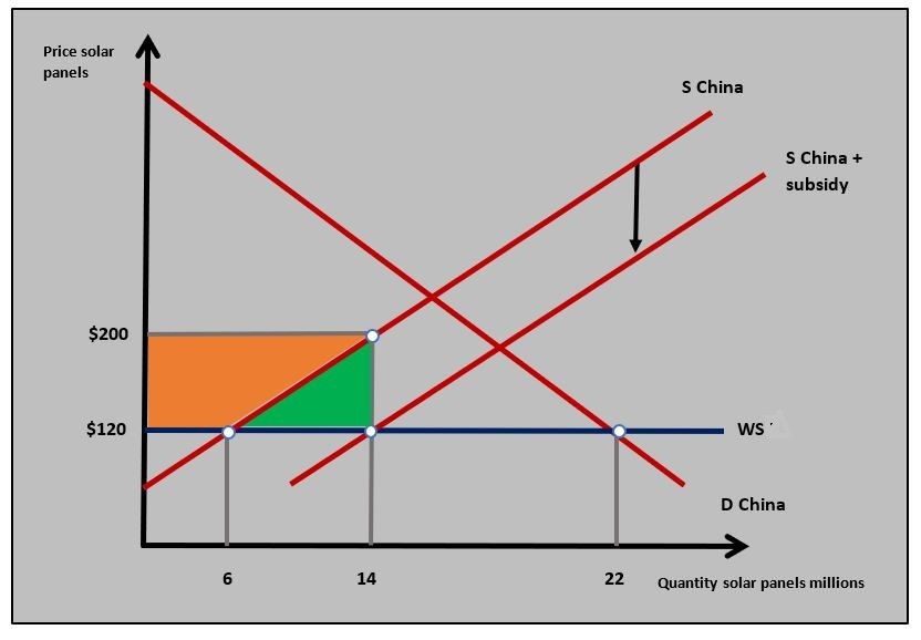 • The brown shaded triangle is also a welfare loss. This is the loss of consumer surplus from people who no longer buy solar panels. Their loss of surplus is not gained by domestic producers or by the government as tariff revenue.