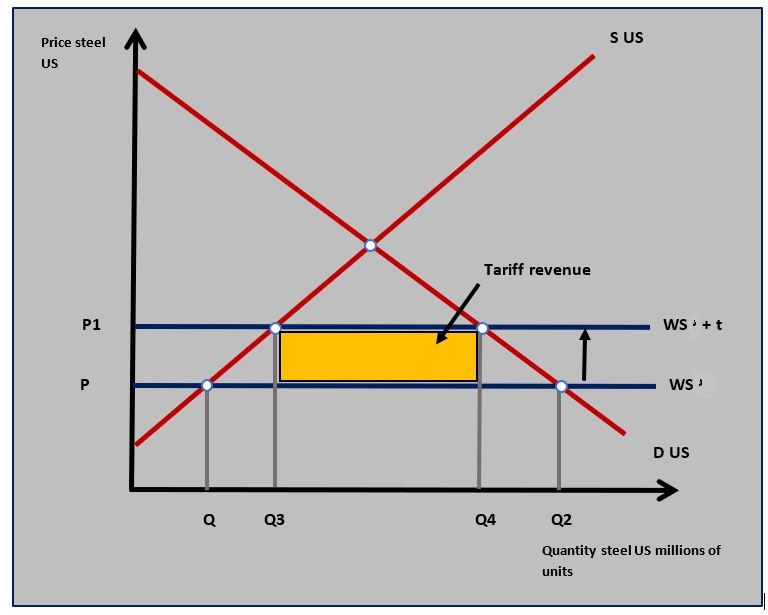 • An explanation of how tariffs reduce the quantity of imported steel from Q-Q2 to Q3-Q4 in the diagram.