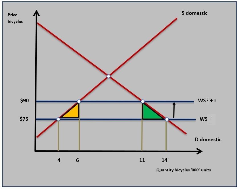 • The yellow triangle is a welfare loss associated with the cost of inefficient domestic producers in the market for bicycles who could not compete in the market when there were no tariffs. These costs occur because of the tariff and are therefore a welfare loss.