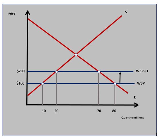 Adding a $40 tariff per unit to solar panels increases the world supply price and shifts WS up to WS + t to a price of $290. At the higher price of $290 US quantity demanded will fall to 18 million units and the domestic US quantity supplied increases to 10 million units. The increase in price to $290 means more US solar panel suppliers can make a profit and cover their costs.  As US solar panel quantity demanded falls and quantity supplied rises, the quantity imported falls to 8 million units (18m – 10m = 8m).