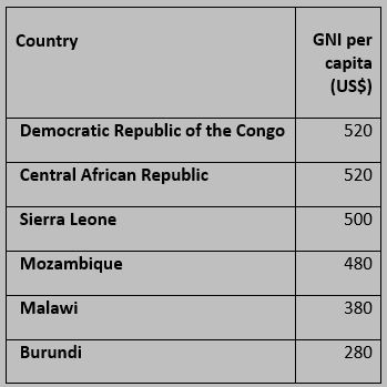 The table shows six of the poorest countries in the world based on real GNI per capita in 2019.