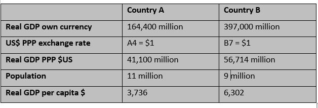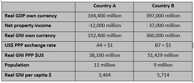 The real GNI per capita is shown in the table. Based on the real GDP/GNI per capita for Country A and Country B we might conclude that Country B’s higher value on both measures means it is more economically developed.