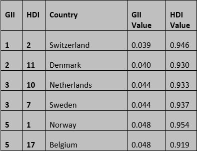 The GII aims to show the differences in the distribution of achievements between women and men in a country. It also measures the human development costs of gender inequality. The higher the GII value of a country the greater the disparities between men and women in the population. A low GII value is an indicator of more advanced economic development in a country. The table illustrates the GII values in 2019 for the five leading countries in the world on this metric.