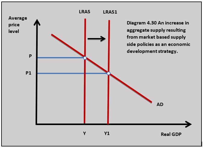 Detailed coverage of market-based supply-side policies is covered in Unit 3.7(1). A market-based supply-side policy can be used as a development strategy when the government allows the market to facilitate economic development in an ELDC. By creating greater efficiency on the supply side the potential output of the ELDC is increased and this leads to long-term economic growth and economic development. Diagram 4.30 illustrates the impact of market-based supply-side policies on potential output.