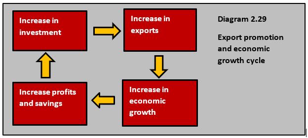 - Export promotion allows an ELDC to enter a growth cycle which is shown in diagram 4.29. The key benefit of the exports is the way they provide funds for new investment as firms make more profits from exports. The profits can then be used to buy new capital and improve productivity leading to long-run economic growth.