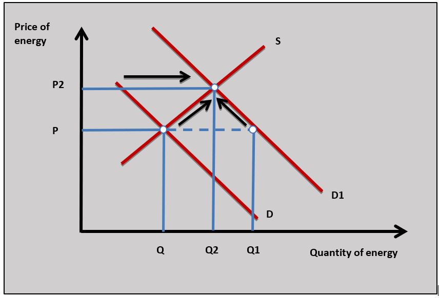 As the world economy has recovered following the Covid19 pandemic the demand for energy has increased. A rise in demand for gas is part of this and the price of gas has increased which has had a signalling and incentive effect on consumers and producers in the market for gas. Gas producers have responded to the opportunity to earn more profit from a rising gas price by increasing the quantity supplied and consumer have responded to the higher gas price by reducing quantity demanded. The higher gas price fulfils the rationing function of price and the market clearing price for gas is reached. The impact of a rise in the demand for gas is shown by an increase in demand from D to D1 leading to a rise in in price to P2.