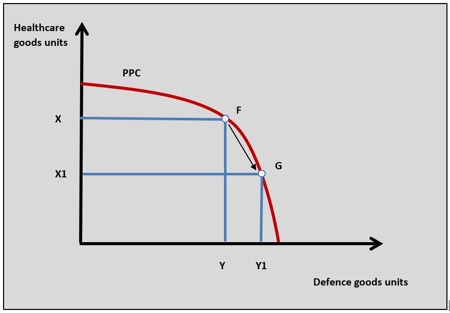 allocated to defence can be looked at in terms of resources not allocated (foregone) to healthcare or education. This can be illustrated by a production possibility curve which is shown in the diagram opposite. As the US economy moves from F to G on the PPC curve the opportunity cost of producing Y to Y1 more military goods is X to X1 fewer healthcare goods.