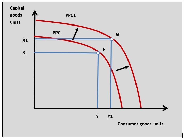 - An increase in the US potential output is shown by a shift in its production possibility curve from PPC to PPC1 in the diagram.