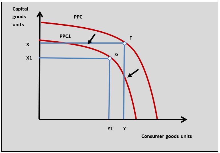 The war in Afghanistan would have destroyed capital because military action often means infrastructure and factories are damaged or destroyed. The war would also have adversely affected the labour force because of the casualties and injuries it caused amongst the Afghan population. The reduced capacity of labour and capital because of the war would have shifted the country's production possibility curve inwards from PPC to PPC1 in the diagram which means the economy's potential output of capital goods falls from X to X1 and consumer goods decreases from Y yo Y1.