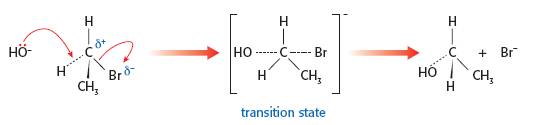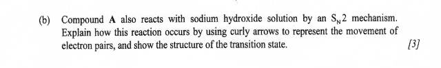 However several examiners argued that the first curly arrow is going to the wrong place as it would be repelled by the existing pair of electrons in the C—Br bond and the two partial bonds are too close in the transition state as they should be 180o apart. I can see their logic but I disagree. For the first point the arrow is shown going to exactly where it will end up in the product and in the transition state it depends on how the three-dimensional shape is represented in two-dimensions. This latter point is, I think, the root cause of many ‘curly arrow’ problems. I think it is best to train your students to show the mechanism in the normally accepted three-dimensional representation and in fact this is specifically mentioned in sub-topic 20.1: Types of organic reactions in the AHL programme. That way there can be no doubt about the fact that the nucleophile is attacking the carbon from the opposite side of its bond to the halogen and that the five-membered transition state has a trigonal bipyramid shape. I enclose the diagram on page 226 of the 2nd Edition of my Chemistry Course Companion to show this.