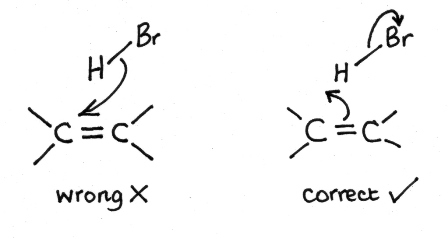 1. Showing the arrow the wrong way round. Typically when showing the electrophilic addition reaction of H—Br with an alkene the arrow comes from the H—Br to the alkene – not the other way round.