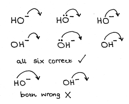 2. Starting the arrow in the wrong place. This is often seen when the hydroxide ion is used as the nucleophile in a nucleophilic substitution reaction with a halogenoalkanes. The arrow must start either from the negative charge on the hydroxide ion or even better from a non-bonding pair of electrons on the hydroxide ion. It will be penalised if it is shown originating from the hydrogen atom.
