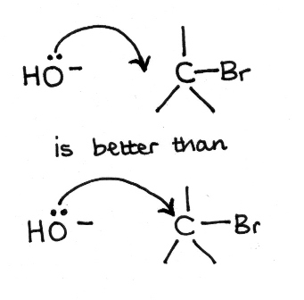 3. Finishing the arrow in the wrong place. There is some disagreement with some examiners here who have been brought up to draw the arrow going directly to the carbon atom in a nucleophilic substitution reaction. From the definition the arrow should end up where the bond will be formed which will be between the carbon atom and the HO– group when it is bonded.