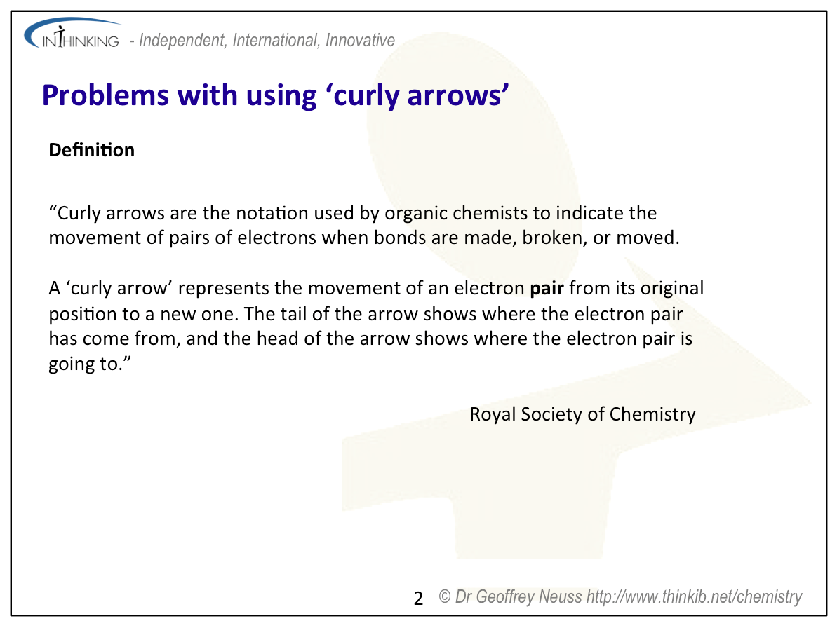 One of the main problems is the definition of what a ‘curly arrow’ actually means. The best definition and the one used by the IB and supported by the Royal Society of Chemistry is: