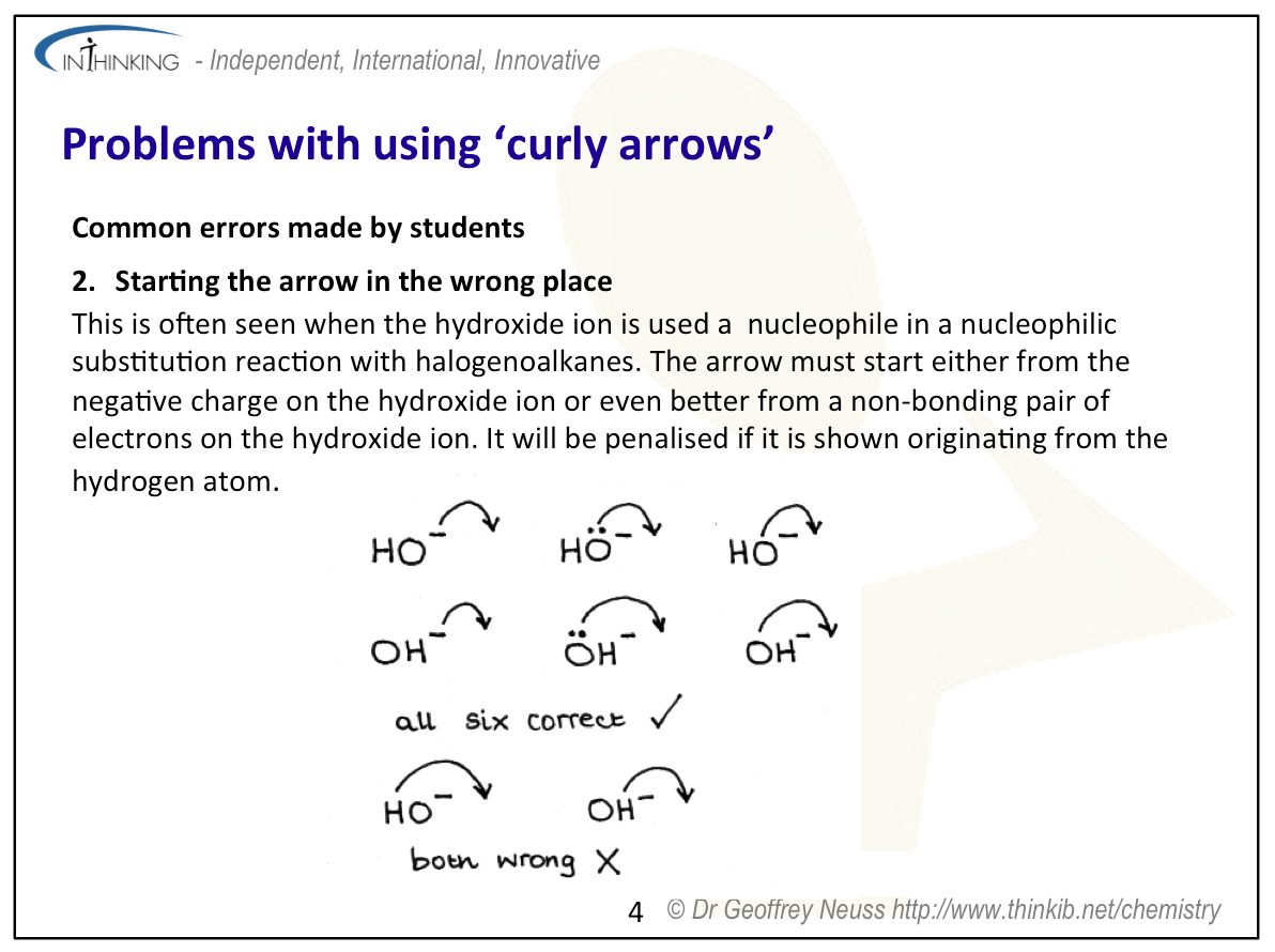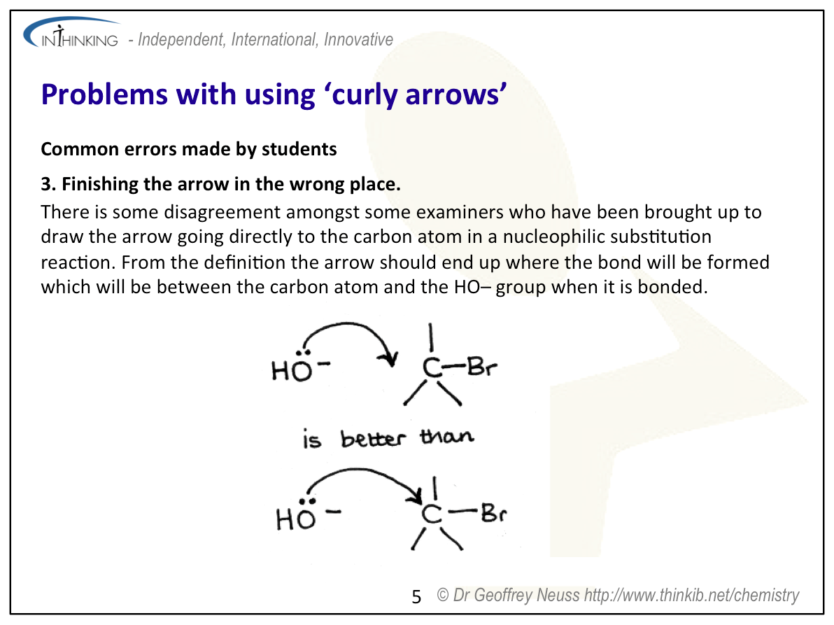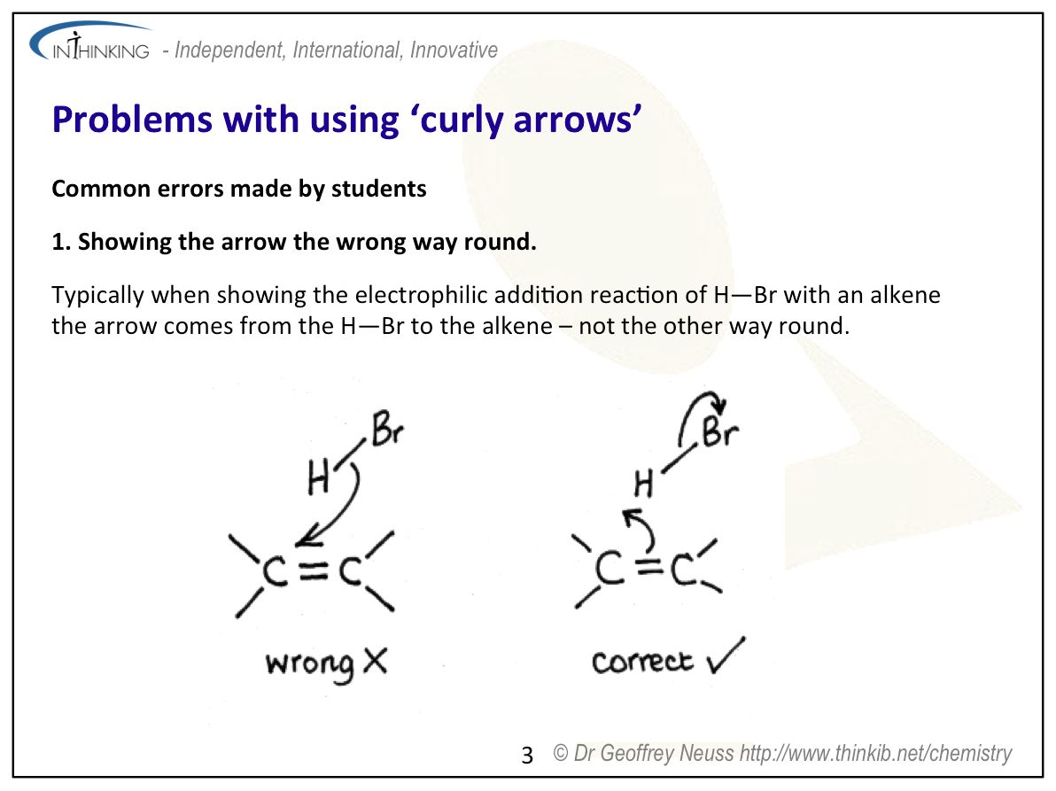The correct use of curly arrows causes real problems – both to students (and teachers) and examiners. The main reason why students fail to score marks is that they use the arrows completely wrongly but even when arguably they have been used correctly students can still fail to score marks depending on how examiners interpret the markscheme. What I hope to show is how students can use them correctly so that they can be certain to get full marks. I have included a slide presentation you can use to illustrate the main points to students.