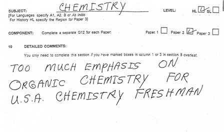 It is worth doing two things before you complete the form. Talk to your students immediately after they have done each examination paper. They will tell you of anything they found particularly difficult or unusual and give you their overall impression of the papers. This can alert you to any particular problem areas. Then after 24 hours have passed you can obtain the examination papers from the IB coordinator in your school. Set aside some quiet time and do the papers as if you were a student. You will then get a good grasp of any areas you feel are worth commenting on. If there is more than one chemistry teacher in your school discuss the papers with your colleagues and submit a joint feedback form. There is one other way to spot potential problem areas. Many teachers air their views on the various chemistry discussions forums. They should not discuss anything until at least 24 hours after the examination has finished for obvious reasons (there may be students in other countries who have not yet started the exam). Because of this teachers are not actually allowed access to the papers until 24 hours have elapsed from the time the examination finished. When you read other teacher’s comments check that they are referring to the papers in the same time zone as the exam taken by your students.