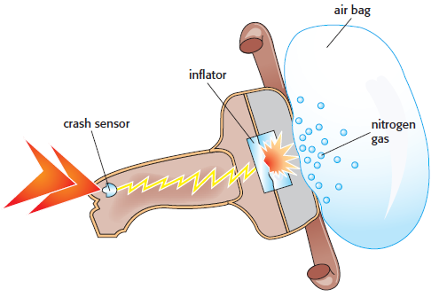 The silicon dioxide is present to convert the oxides of potassium and sodium that are produced into harmless silicates. When a crash occurs, a sensor in the car’s airbag will trigger the reaction if the driver (and passengers) continues to move forward with a momentum greater than the equivalent of hitting a brick wall at 16–24 km h–1. The nitrogen has to be produced to inflate the bag more quickly than the time taken for the driver to hit the steering wheel. The whole reaction from triggering to complete inflation of the bag is complete in less than one 25th. of a second.