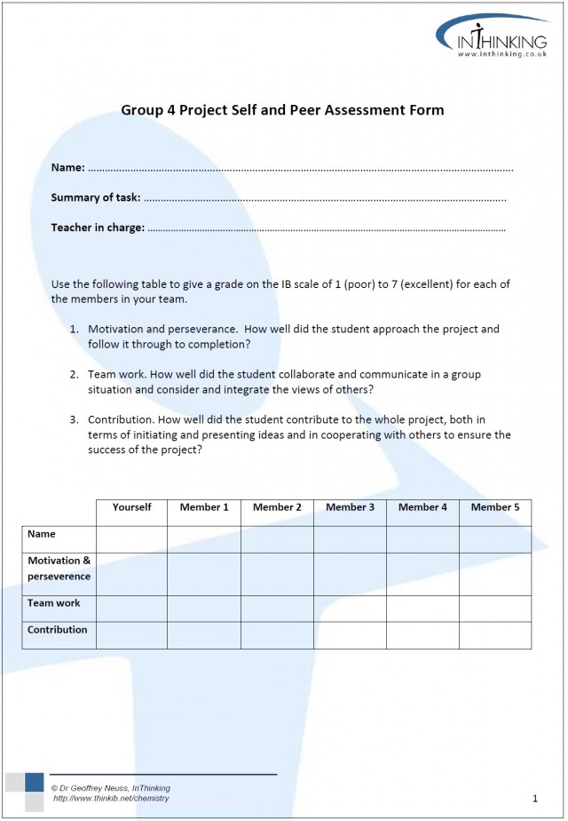 The personal reflection is a statement of each student’s involvement in the project. What many schools do is get the students to evaluate the other students who worked with them on their team (peer-evaluation) and then ask each student to also refer to these evaluations from their peers when it comes to their own personal reflection. The IB probably only needs the personal reflection to show that the student has actually done the project as it is not formally assessed However from an educational point of view it is good for students to reflect on how well they work with others and how others see their contribution. It could be helpful to give the students two sorts of evaluation forms for them to complete. The two examples below can also be downloaded if you wish to use them.