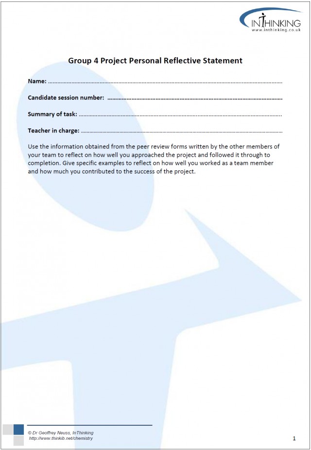 A reflective statement written by each student on their involvement in the group 4 project must be included on the coversheet of their internal assessed Individual Scientific Investigation. The precise details about how this should be done is given in the IB Handbook of procedures. The form that must be completed is called the 4/ICCS and the personal reflection should be about 50 words long. In addition to the title of the group 4 project undertaken, a separate box is included on the cover sheet form for the reflective statement. The current version of form 4/ICCS can be downloaded from the Diploma Programme Assessment Procedures (Section: Assessment forms) available on the resources section of My IB.