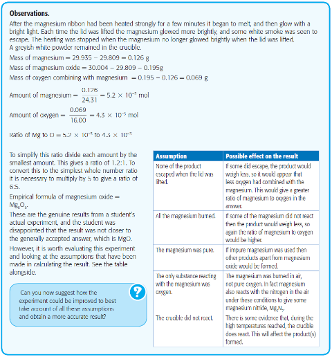 Students are often pleased if they do obtain MgO for the empirical formula or disappointed if they do not. Ask the students what assumptions they have made and how each might affect the result if they were not true. There are many false assumptions, perhaps the biggest is that the magnesium is combining only with the oxygen in the air whereas in reality much of the product is magnesium nitride not magnesium oxide. If you do use the beer caps then you have to assume that the paint that burns off will not affect the result but in fact the mass change due to this is insignificant and should have little or no effect. You can then ask them how the experiment could be improved to give a more accurate answer. A full explanation of this together with how the calculation should be carried out using sample results is given below and can be downloaded as a pdf file,