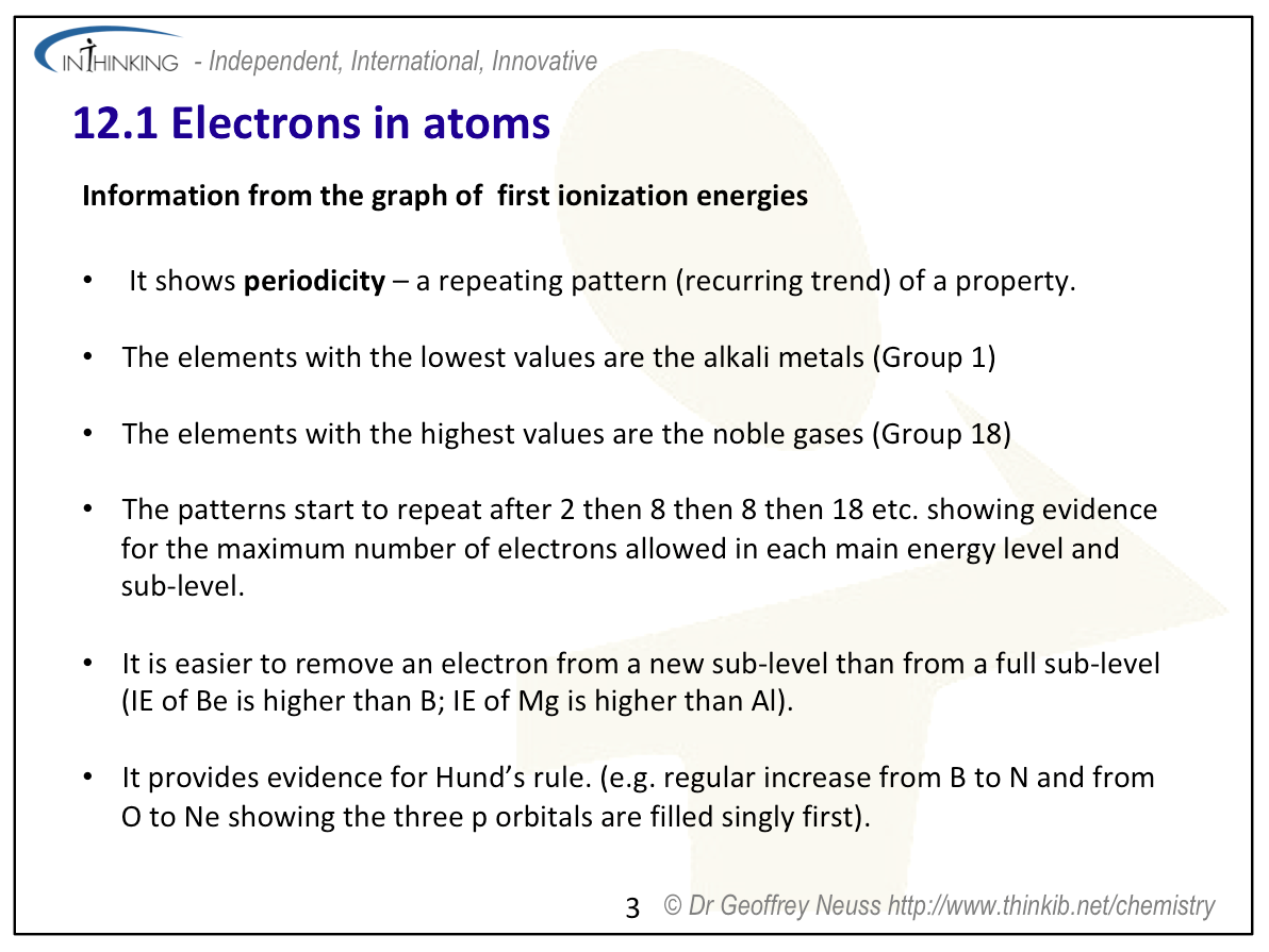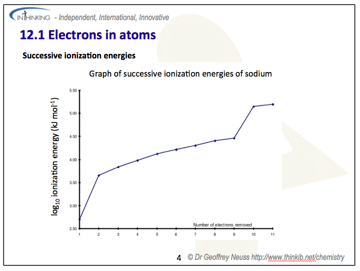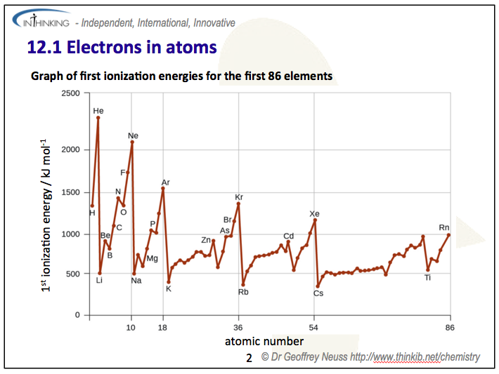 Teaching tipsThis topic puts some flesh on the core Topic 2.2 - Electron configuration. I introduce the content of both topics by getting students to perform flame tests on various metal salts. You can either do this in the traditional way using a Bunsen burner with a nichrome wire or by using an atomiser. This then leads on to looking at discharge tubes with a diffraction grating and then showing them pictures of actual spectra. From this it is quite easy to introduce the idea of the electromagnetic spectrum and the relationships between wavelength, frequency, velocity and energy (c = λv and E = hv). The background I have given above in 'Pause for thought' goes much further than is necessary but for clever students it does show that the connection between atomic spectra and electrons is based on both observation and deduction which is an excellent TOK point to make. n1 and n2 are of course principal quantum numbers and although students do not need to understand quantum numbers it is good for them to see how the energy levels are described and also converge.Stress the importance of the discrete lines and also the difference between emission and absorption spectra. They should know that the biggest difference between any two energy levels is between level 1 and level 2 and the ionization energy for hydrogen can only really be calculated from the ultraviolet spectrum (Lyman series) as in this series all the electrons are falling back to the ground state (n = 1). Although it is actually listed under this topic I do get Standard Level students to plot the graph of first ionization energy against atomic number as I think it helps to provide good evidence for sub-levels (see Topic 2.2). This topic goes further with graphs of successive ionization energies which provide further evidence. Stress that the large jumps seen in the graphs of successive ionization energies relate to when electrons are being removed from a new (inner) main energy level. | Study guide