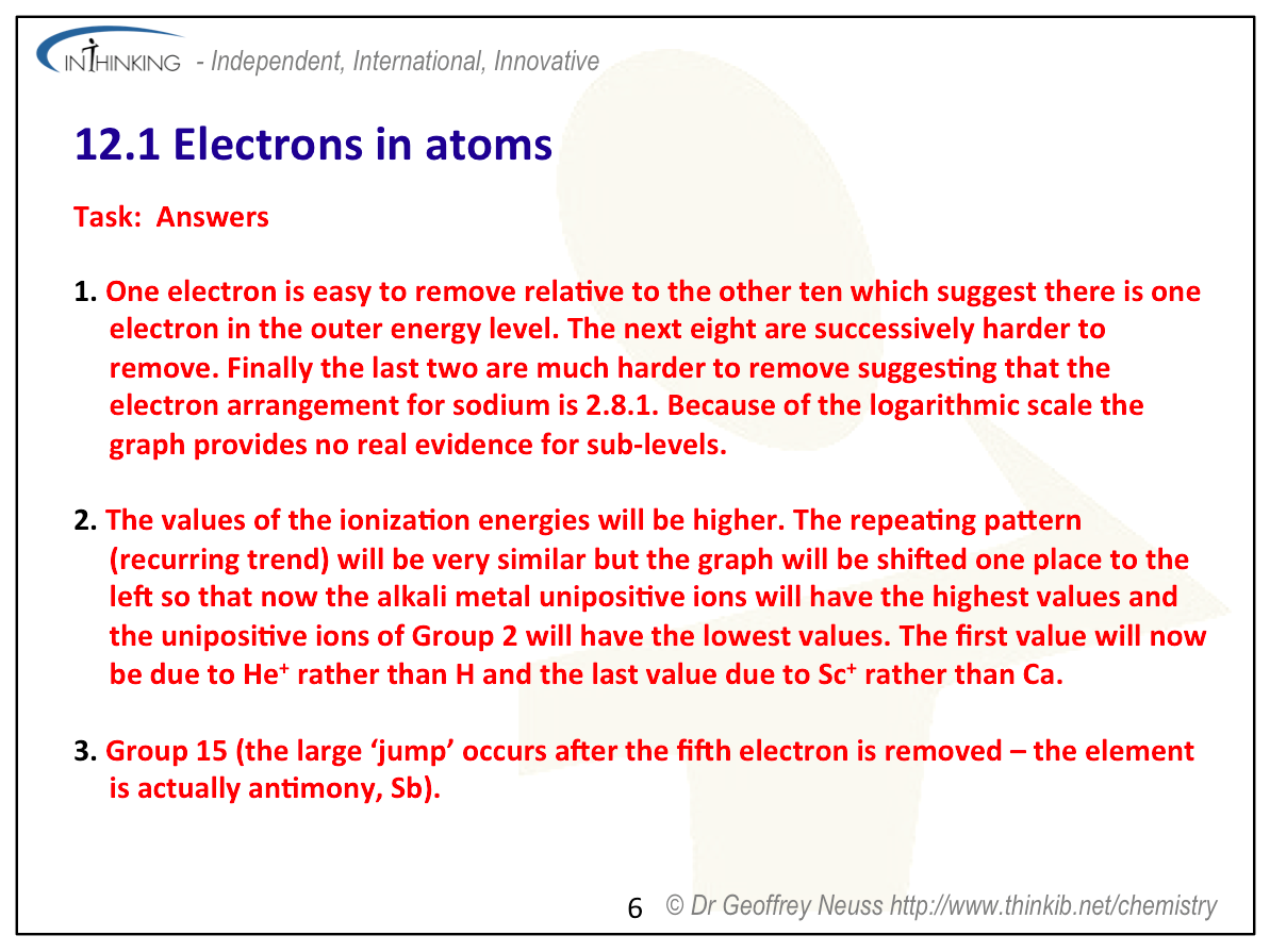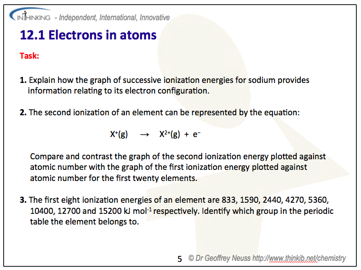 Page 13 QuestionsFor ten 'quiz' multiple choice questions with the answers explained see MC test: Electrons in atoms. For short-answer questions which can be set as an assignment for a test, homework or given for self study together with model answers see Electrons in atoms questions. Vocabulary listIonization energy
