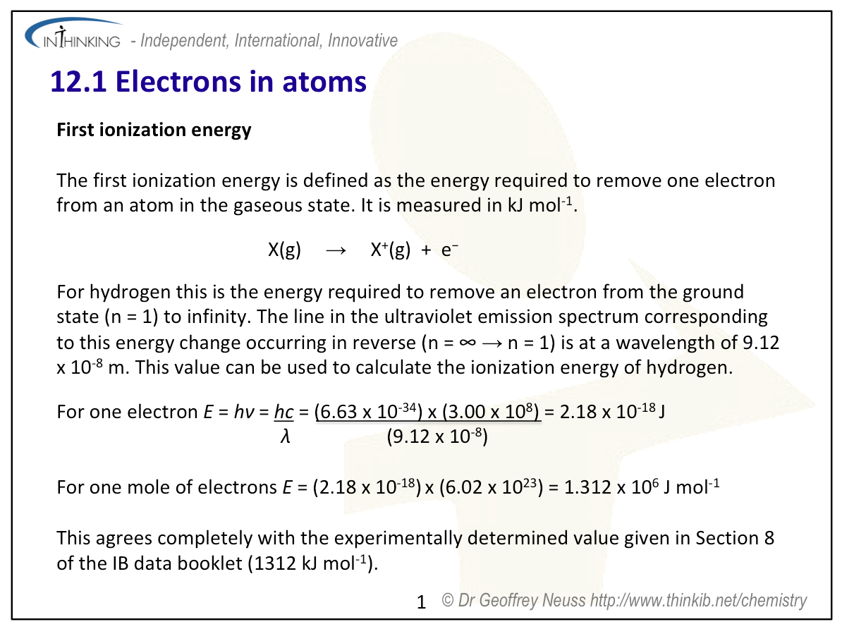 = 1.313 x 106 J mol−1 = 1313 kJ mol−1 which agrees completely with the experimentally determined value given in Section 8 of the IB data booklet (1312 kJ mol−1).This provides strong evidence that atomic spectra are due to electron transitions between energy levels within the atom.