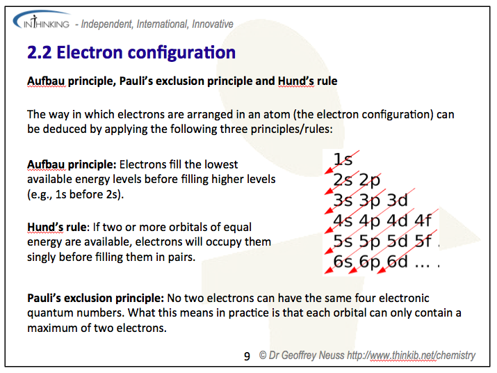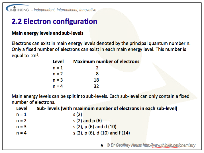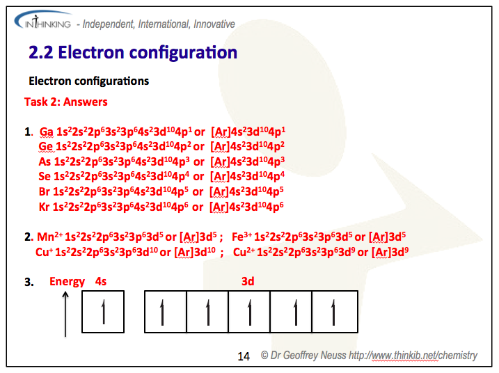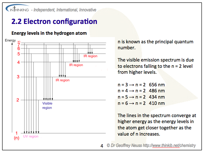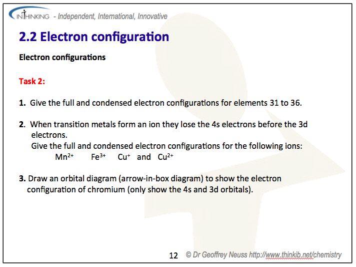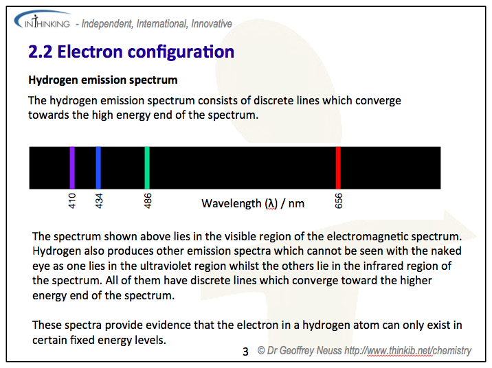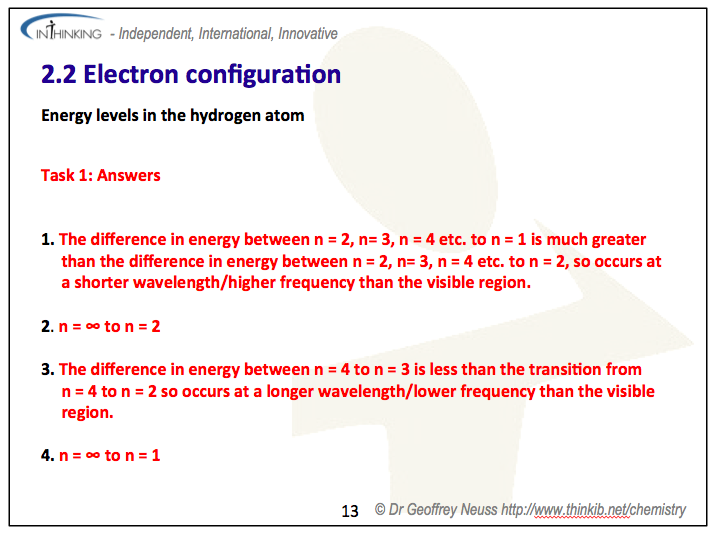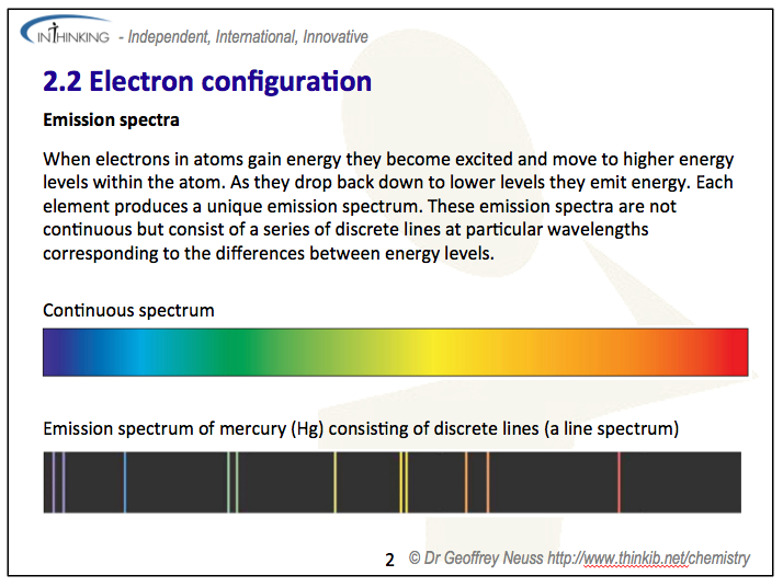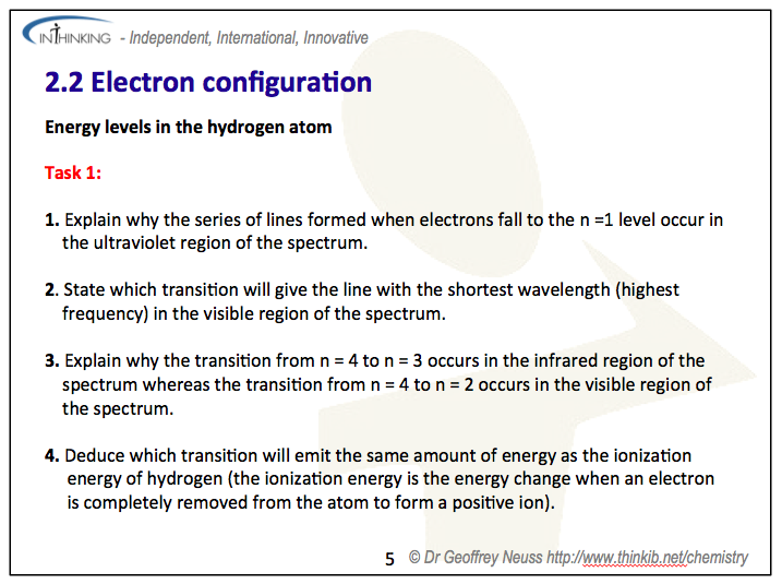 Pages 11 - 12 QuestionsFor ten 'quiz' multiple choice questions with the answers explained see MC test: Electron configuration. For short-answer questions which can be set as an assignment for a test, homework or given for self study together with model answers see Electron configuration questions. Vocabulary listemission spectrum IM, TOK, 'Utilization' etc.See separate page which covers all of Topics 2 Practical work