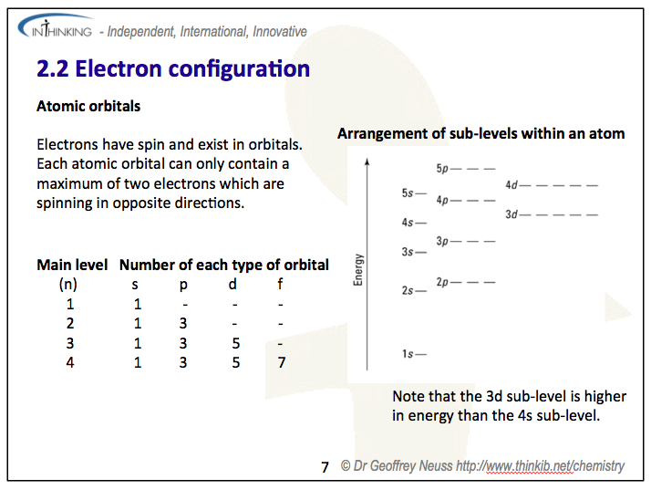 Teaching tipsThis is quite a large topic and you will need to tread carefully as students are asked to apply a lot of knowledge without really being required to understand the theories and principles upon which it is based. Using flame tests and/or gas discharge tubes linked to a spectrometer you can use the emission spectra to provide evidence that electrons are in fixed energy levels. It is good that students now need to understand the concept of orbitals and the splitting of the main energy levels into s, p, d and f sub-levels. Even though it is not on the Standard Level programme for this topic (it is on the Higher Level under 12.1 and is mentioned in Topic 3.2) I still get students to plot the graph of first ionization energy against atomic number for the first twenty elements and then show them the graph for the first eighty or so elements (see Topics 2 & 12). The shape of this graph not only shows periodicity but can easily be related to the existence of sub-levels and how many electrons can occupy each sub-level. Using this knowledge the electron configuration for each element can then be deduced. I feel giving them this evidence, which they can easily comprehend, is better than just telling them about electron configurations with no real evidence at all. Ultimately students should understand how they can use the s, p, d & f blocks in the periodic table to deduce the electron configuration (see Topic 3). Stress the importance of energy levels and 'going into the lowest available level' and this can then be used to explain the two main 'exceptions'. Chromium is [Ar]4s13d5 as it has all the 4s and 3d electrons spinning in the same direction which is more energetically favourable than [Ar]4s23d4. Similarly copper is [Ar]4s13d10. It is also worth explaining that when electrons are removed from transition metals the ion formed has one 4s electron less than the neutral atom. This is because the protons in the nucleus of the positive ion 'pull' the energy levels closer to the nucleus so 3d becomes lower in energy than 4s. See the separate page on The electron configuration of scandium.