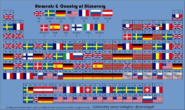 One rather neat way to show how scientists from many different countries have contributed to chemistry is to portray the periodic table by country of discovery. The following table, put together by Jamie Gallagher, is from Smithsonian.com.