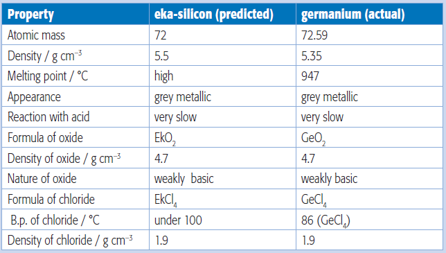 The proposal of a periodic table by Mendeleev in 1869 must rank as one of the greatest achievements in science. Mendeleev could not logically deduce a relationship between the elements from the elements known at the time. He had to use his imagination and take a leap of faith (i.e. be a risk taker) that some elements still remained to be discovered if his periodic table was to work. Science is about making predictions and Mendeleev's prediction for the chemical and physical properties for the as then undiscovered element eka-silicon (now known as germanium) was truly amazing in its accuracy.