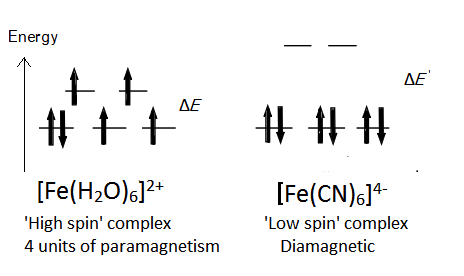The electron configuration of iron is 1s22s22p63s23p64s23d6 so, when the two 4s electrons have been lost to form the ion, Fe2+ will have the configuration [Ar]3d6. In an octahedral complex the five d orbitals are split with three of them going to lower energy and two to higher energy. Applying the Aufbau principle of filling the lower energy orbitals first the six electrons will form three pairs of electrons in the lower three 3d orbitals and so the complex ion will exhibit no paramagnetism, i.e. it will be diamagnetic. This seems straightforward logic but it ignores the effect of the ligands and in particular their position in the spectrochemical series. Ligands high in the series such as CN¯ cause large splitting (see diagrams where ΔE' > ΔE) and the complex [Fe(CN)6]4¯ is indeed diamagnetic as it has no unpaired electrons. However when water is the ligand the splitting is much less and now it is energetically favourable to apply Hund's rules and the complex ion [Fe(H2O)6]2+ has four unpaired electrons and is consequently paramagnetic.