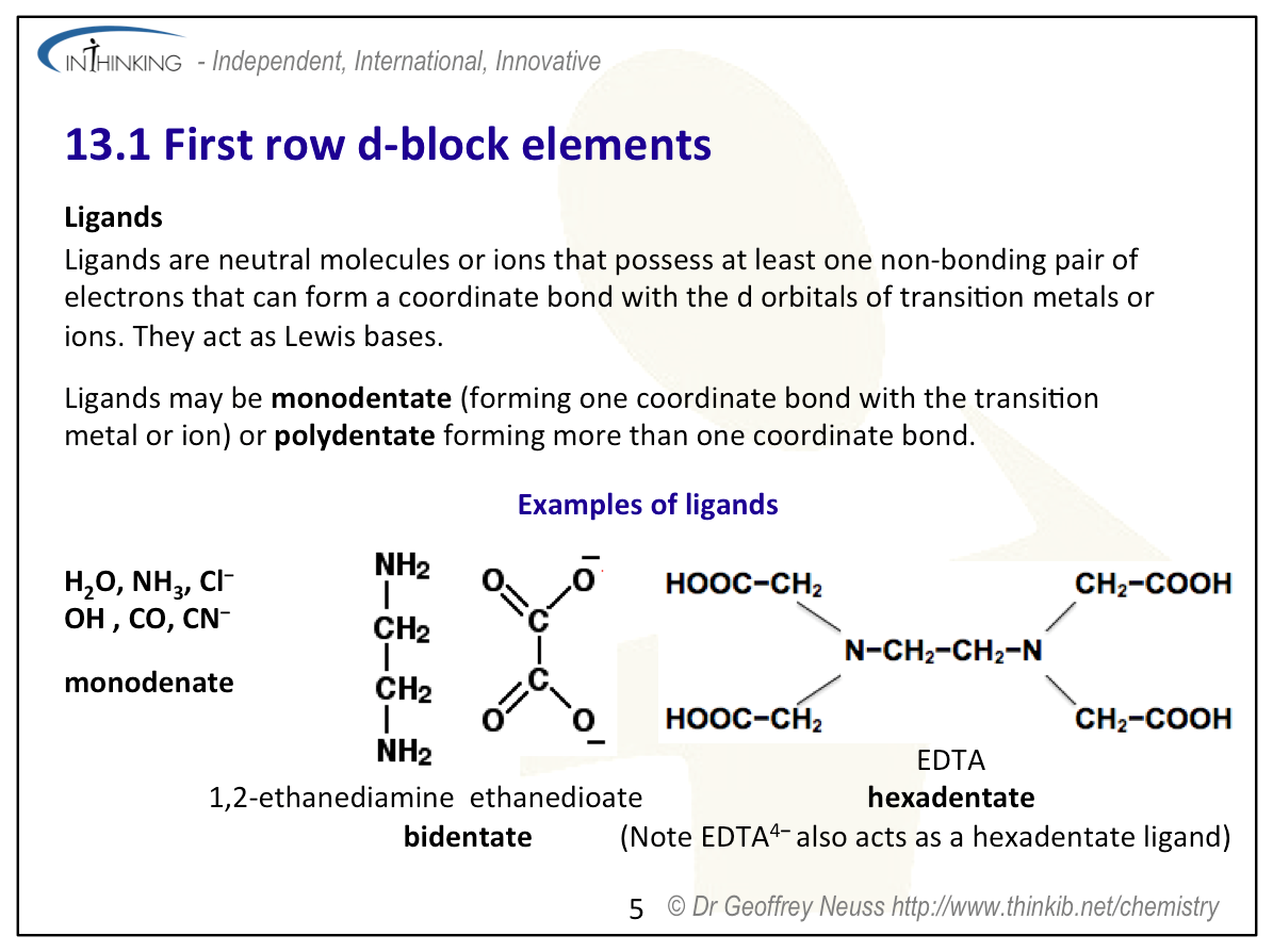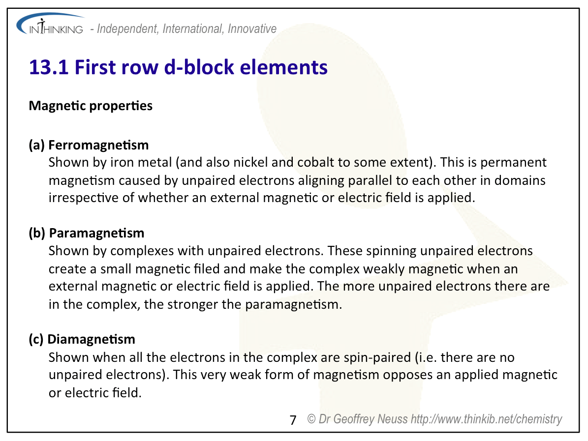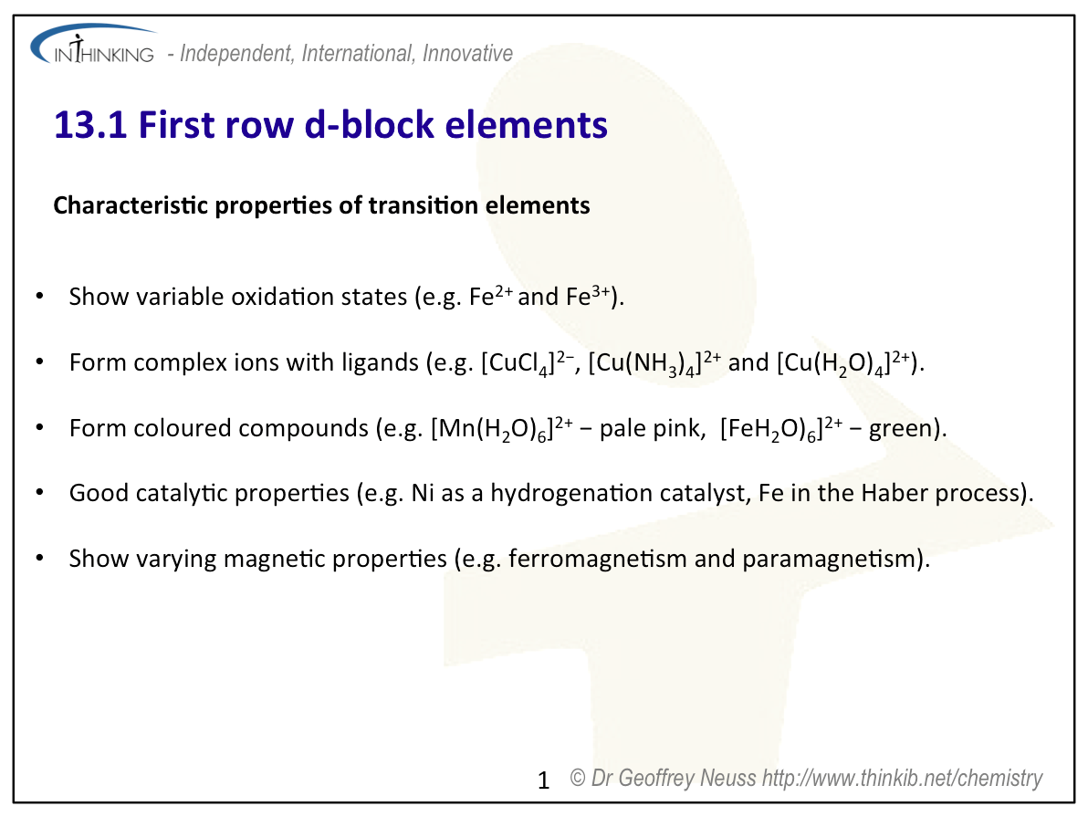 Teaching tipsThere is quite a lot to cover in this sub-topic and not a lot of time (4 hours in total for Topics 13.1 and 13.2) so stick to the syllabus carefully and do not go into extra detail about individual transition/d-block elements/metals/complexes/compounds (note that they are called all of these in the syllabus!) unless you particularly want to. The questions students will be asked in the exams are very much on the general principles rather than on specific detailed chemistry of particular compounds. Much of the chemistry is related to the electron configuration (remember that the particular cases for chromium and copper should be known). After defining what is (and what is not) a transition element I focus in turn on the different properties they need to cover. Variable oxidation states are relatively easy and there is a good practical involving compounds of vanadium (although that is not one of the elements covered on the syllabus list but it also illustrates E For the complex ions I demonstrate to students the reaction of dilute copper(II) sulfate solution with first concentrated ammonia then concentrated hydrochloric acid and then go back and forth with water in between. I put the beaker on an old OHP and project the reaction onto a screen. There are a lot of fumes so it is spectacular but it illustrates equilibrium well in addition to the formation of different complex ions of copper. Give them practice at working out the total charge on an ion when different ligands are used. If I have a good class I do mention high and low crystal field splitting when I cover paramagnetism (see ‘Pause for thought’ above) but this is going beyond the syllabus. Although catalytic properties are mentioned the ‘Guidance’ does not provide any help as to what should be covered. It is probably enough to mention the difference between homogeneous and heterogeneous catalysis and briefly discuss the importance of variable oxidation states in the formation of intermediate compounds and the ability of transition metals to adsorb gases on their surface. Examples could be limited to iron in the Haber process, vanadium(V) oxide in the Contact process, nickel in hydrogenation and the use of precious metals such as palladium or platinum in catalytic converters. | Study guide