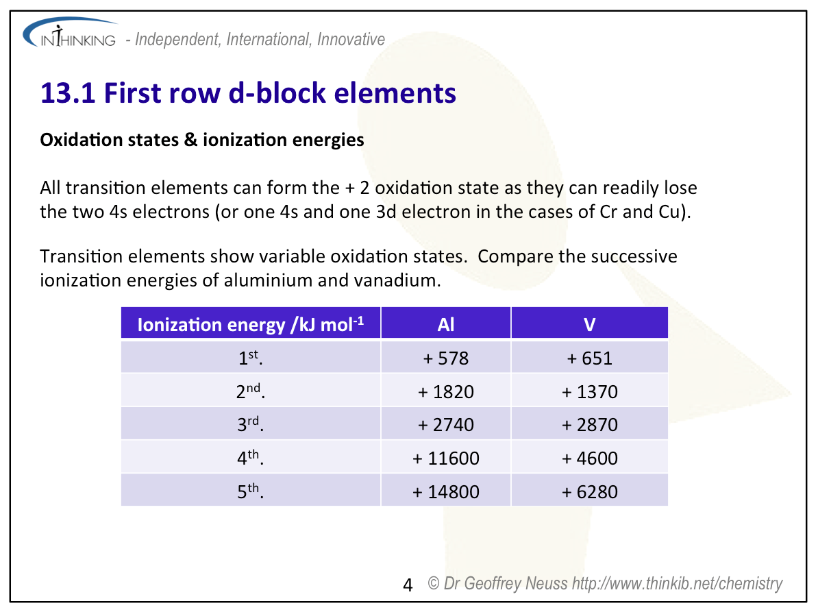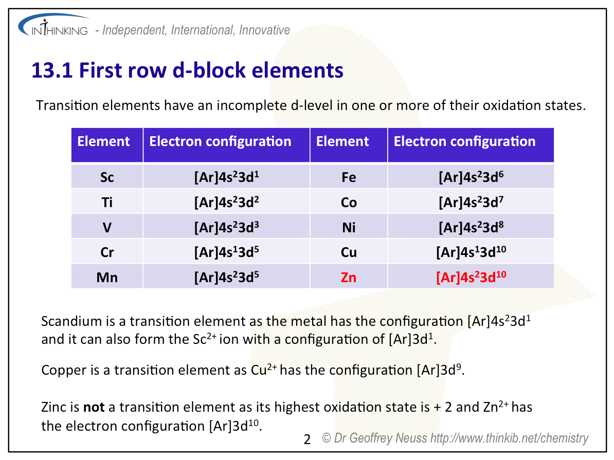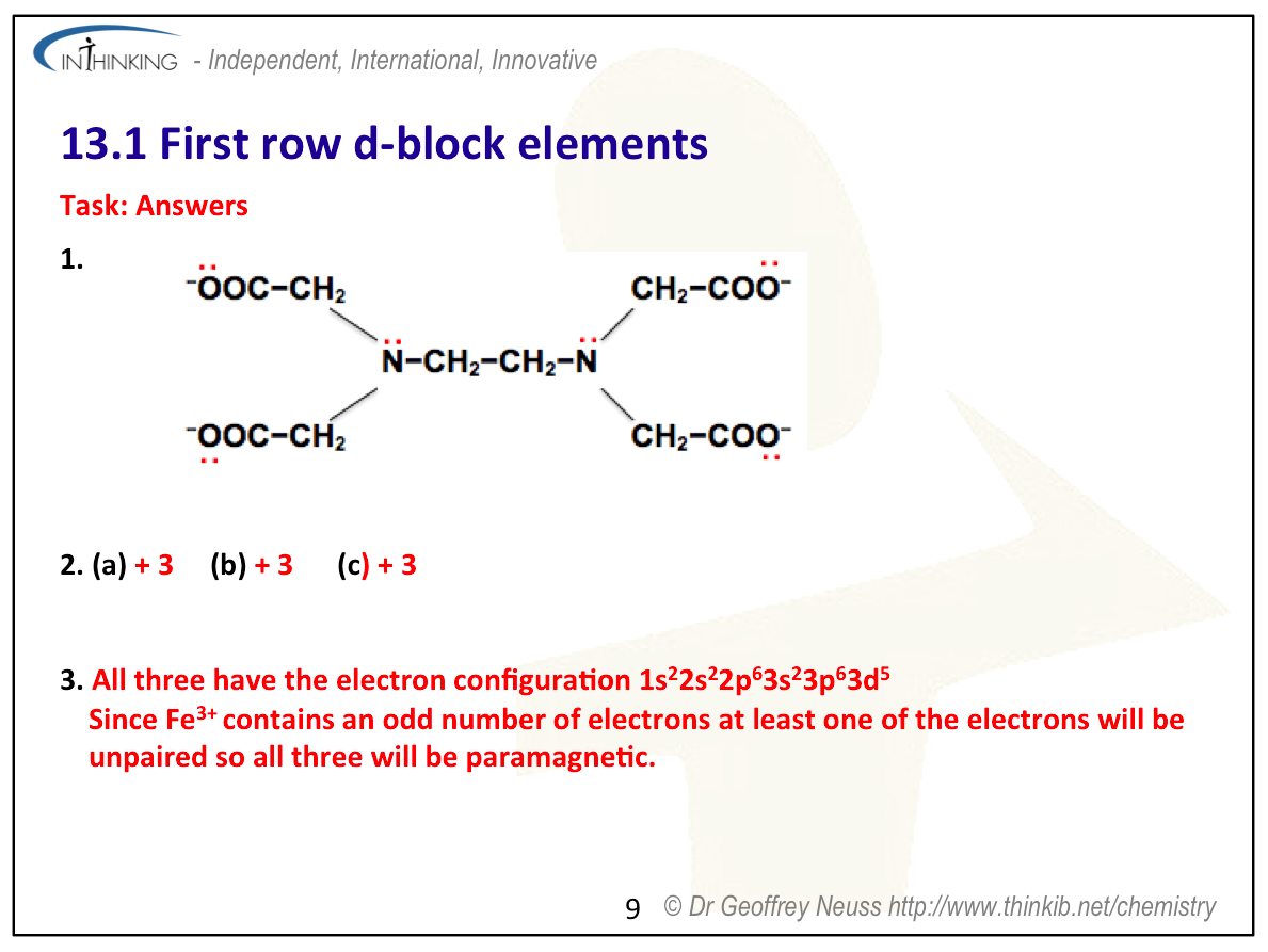 Pages 20-21 QuestionsFor ten 'quiz' multiple choice questions with the answers explained see MC test: First-row d-block elements. For short-answer questions which can be set as an assignment for a test, homework or given for self study together with model answers see First row d-block elements questions.Vocabulary listFor short-answer questions which can be set as an assignment for a test, homework or given for self study together with model answers seevariable oxidation state (or number) IM, TOK, Utilization etc.See separate page which covers all of Topics 3 & 13 Practical work |