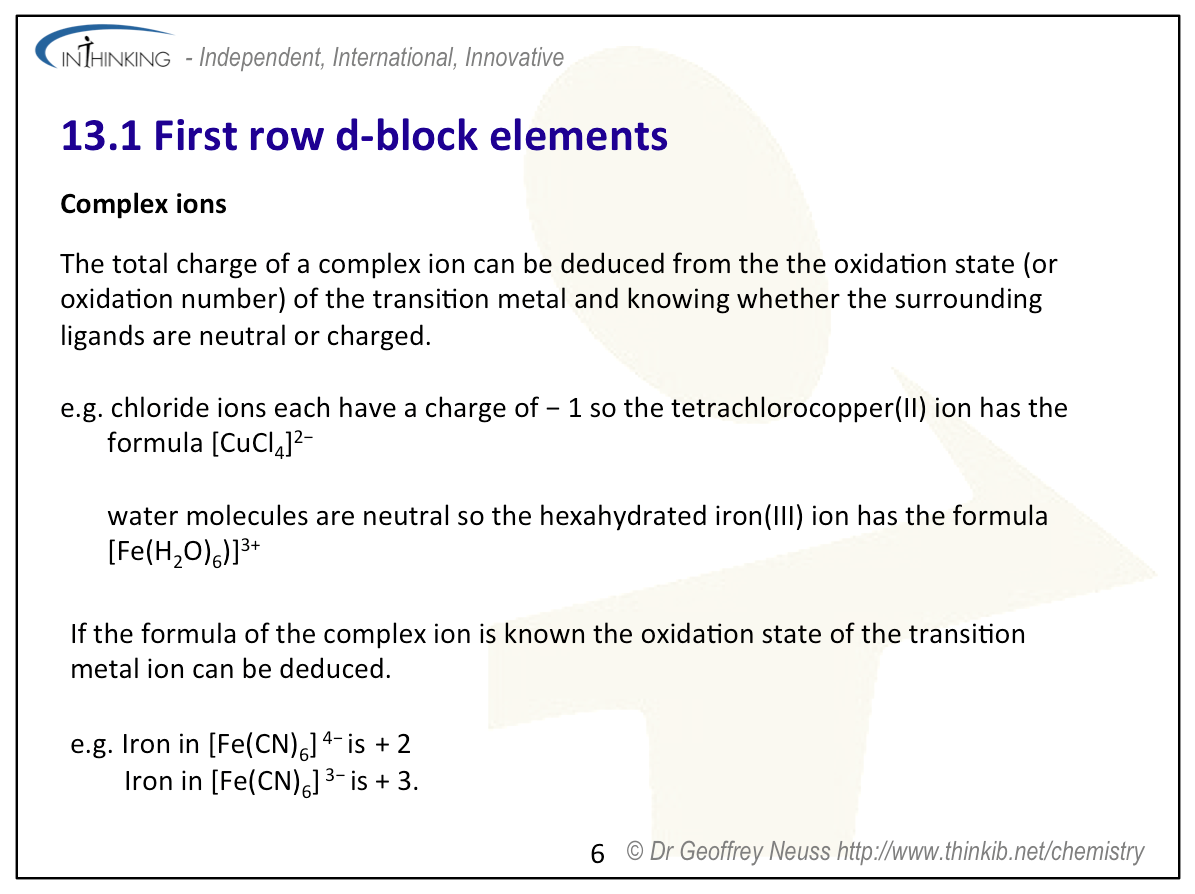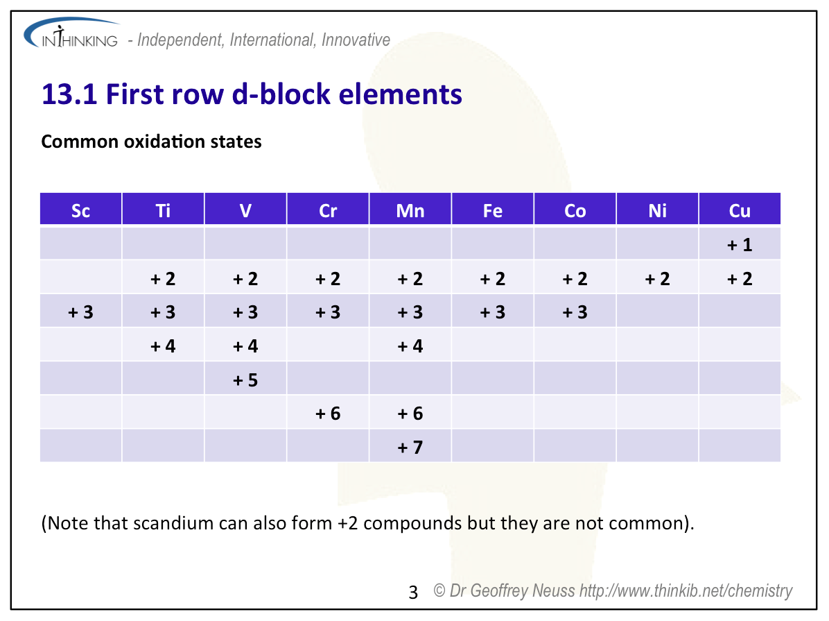 | Clarification notesCommon oxidation states of the transition metal ions are listed in Sections 9 and 14 of the data booklet. International-mindednessBecause of their properties and uses transition metals are important international commodities. For some countries, mining for precious metals is a major economic factor. |