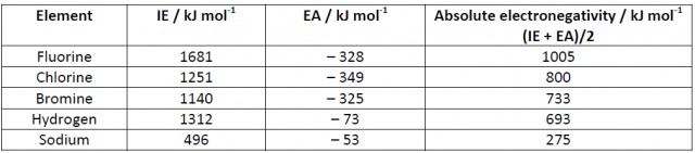 It is an interesting exercise to convert these to the Pauling scale by using the fact that fluorine (1005 kJ mol-1) is equivalent to 4.0 on the Pauling scale. By scaling the other values chlorine (800 kJ mol-1) becomes 800/1005 x 4.0 = 3.2, bromine becomes 733/1005 x 4.0 = 2.9 and by doing similar calculations hydrogen becomes 2.7 and sodium becomes 1.1. These values do compare quite well with Pauling’s scale F (4.0), Cl (3.2), Br (3.0), H (2.2) and Na (0.9). Milliken’s absolute scale is not often used, partly because the electron affinities of some elements are not well-known. Even so perhaps it is worth pointing out to students that there is an absolute scale as well as Pauling’s relative scale. Maybe this could provide some fertile ground for a non-experimental individual scientific investigation?